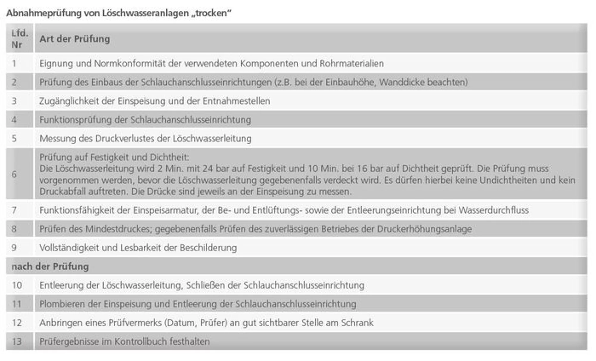 - ist eine Überprüfung der Anlagen auf Einhaltung der von dem Brandschutzkonzept geforderten Aufgabe und Einhaltung der einschlägigen Normen, Verordnungen, BG-Richtlinien, VdS, DVGW und Gesetzen. Unterschiedlich nach Bundesland kann die Abnahme durch einen Sachkundigen oder Sachverständigen erfolgen.