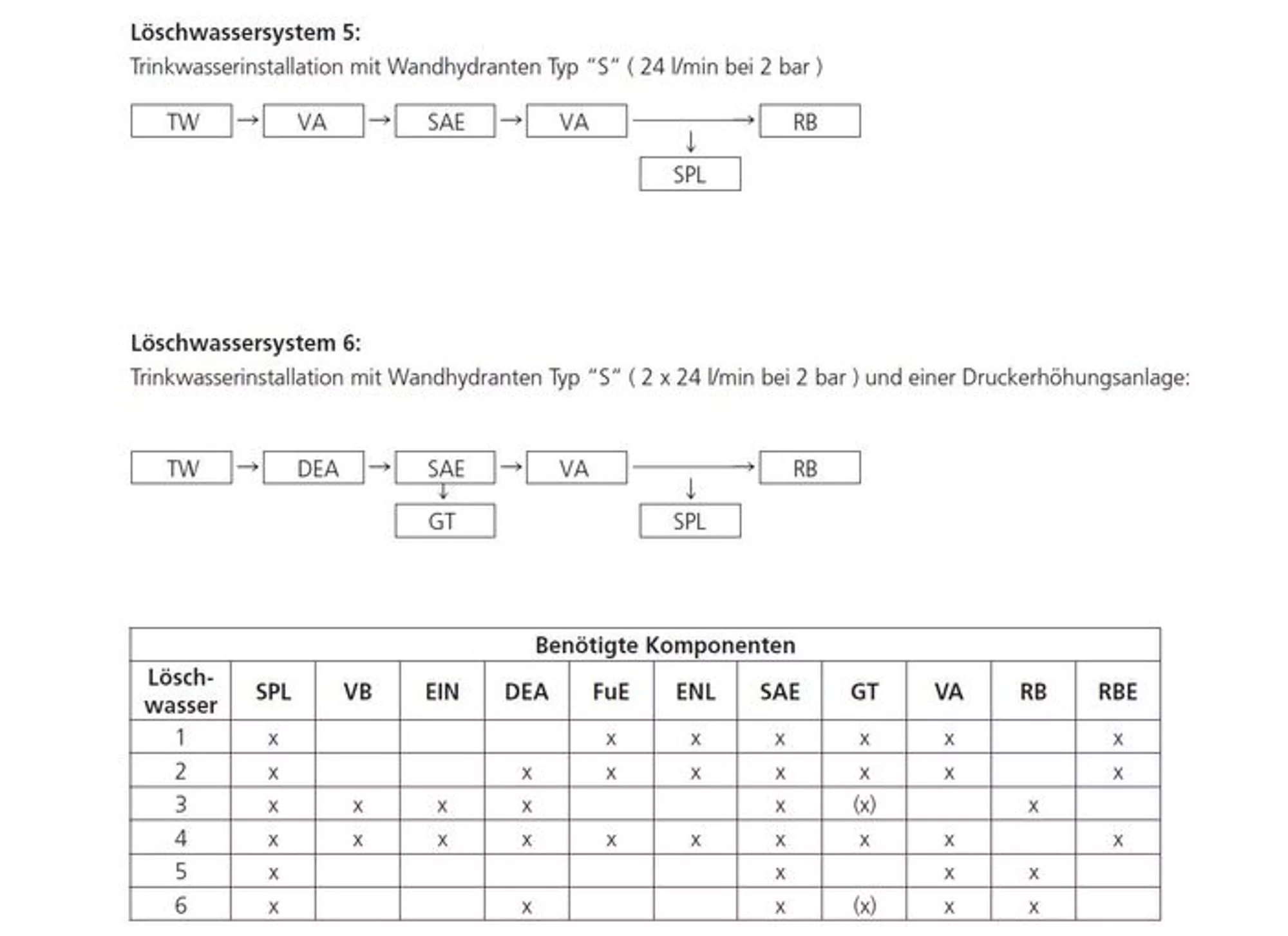 Löschwasserleitung „nass/trocken” mit direktem Anschluss an das Trinkwassernetz und einer Druckerhöhungsanlage, mit hygienischer Trennung durch eine Füll- und Entleerungsstation für Wandhydranten Typ “F“ (3 x 100 l/min bei 3 bar oder 3 x 200 l/min bei 4,5 bar, in Sonderfällen wird dieses System auch für Wandhydranten Typ “S“ eingesetzt): (siehe Abb. 1)
