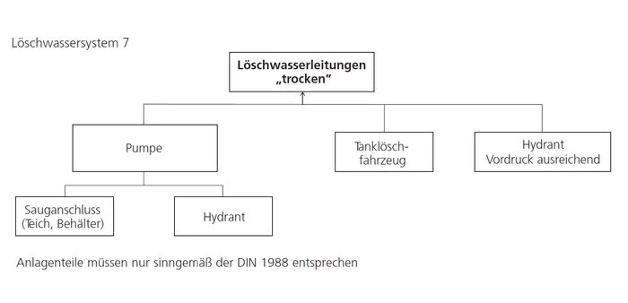 Die vorstehend beschriebenen Löschwassersysteme 1– 6 sind alle an eine Trinkwasserversorgung angeschlossen. Es ist ebenso möglich, diese Löschwassersysteme an eine Nichttrinkwasserversorgung (Brauchwasser) anzuschließen. Alle Anlagenteile müssen dann nur sinngemäß der DIN 1988 entsprechen. Bei Bestands-Löschwassersystemen mit einer erforderlich werdenden Nachrüstung einer hygienischen Trennung, können bei Platzproblemen, in Ausnahmefällen unter Rücksprache mit der Feuerwehr und den Wasserwerken auch ingenieurmäßige Lösungen zum Einbau kommen.