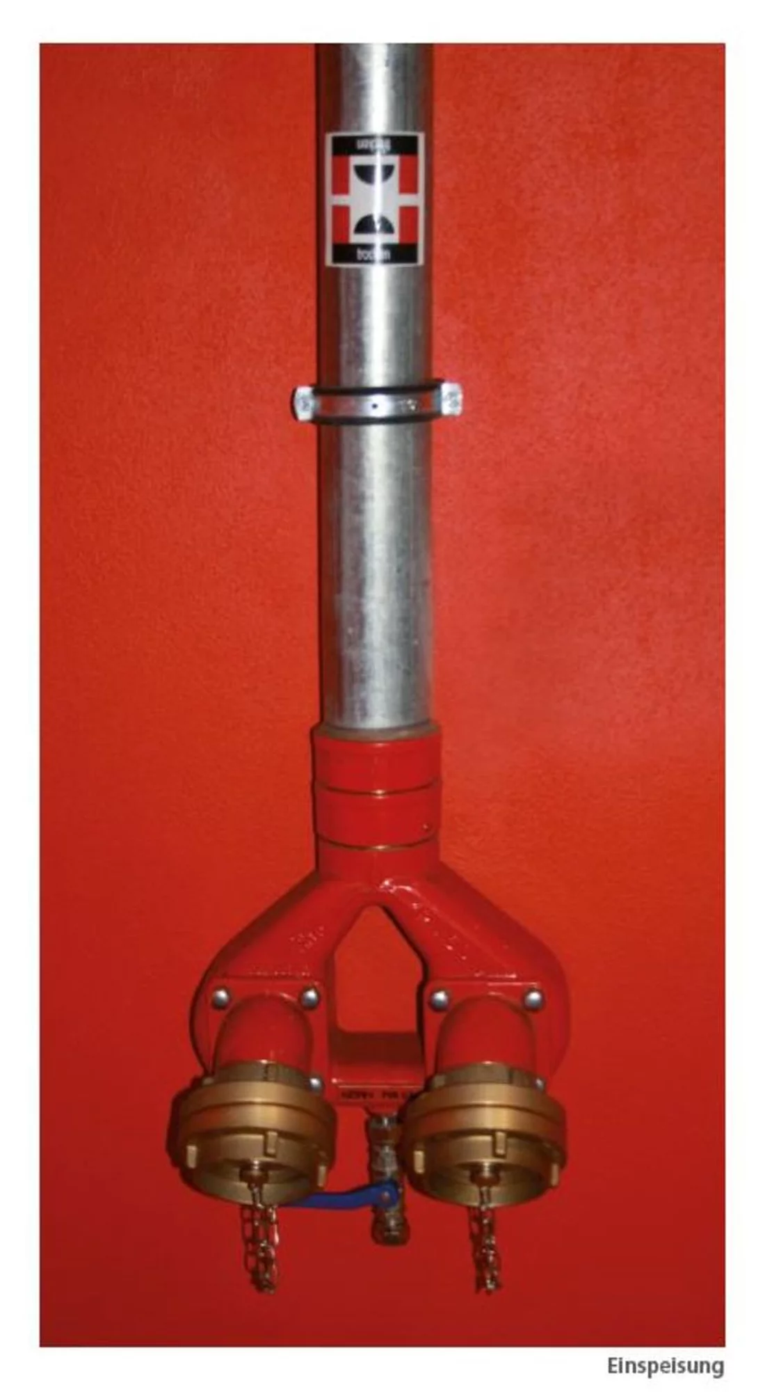 Diese Anlage wird dort eingesetzt, wo die Feuerwehr eine nur für sie bestimmte festinstallierte Löschwasserleitung benötigt. Diese Anlage dient nicht zur Selbsthilfe, sondern ermöglicht der Feuerwehr die Einspeisung und Entnahme von Löschwasser. Liegen Entnahmestellen mehr als 30 m über der Stellfläche für die einspeisende Feuerwehr, so ist eine Druckerhöhungsanlage erforderlich, sofern es im Baurecht nicht anders geregelt ist. (siehe Abb. 4)