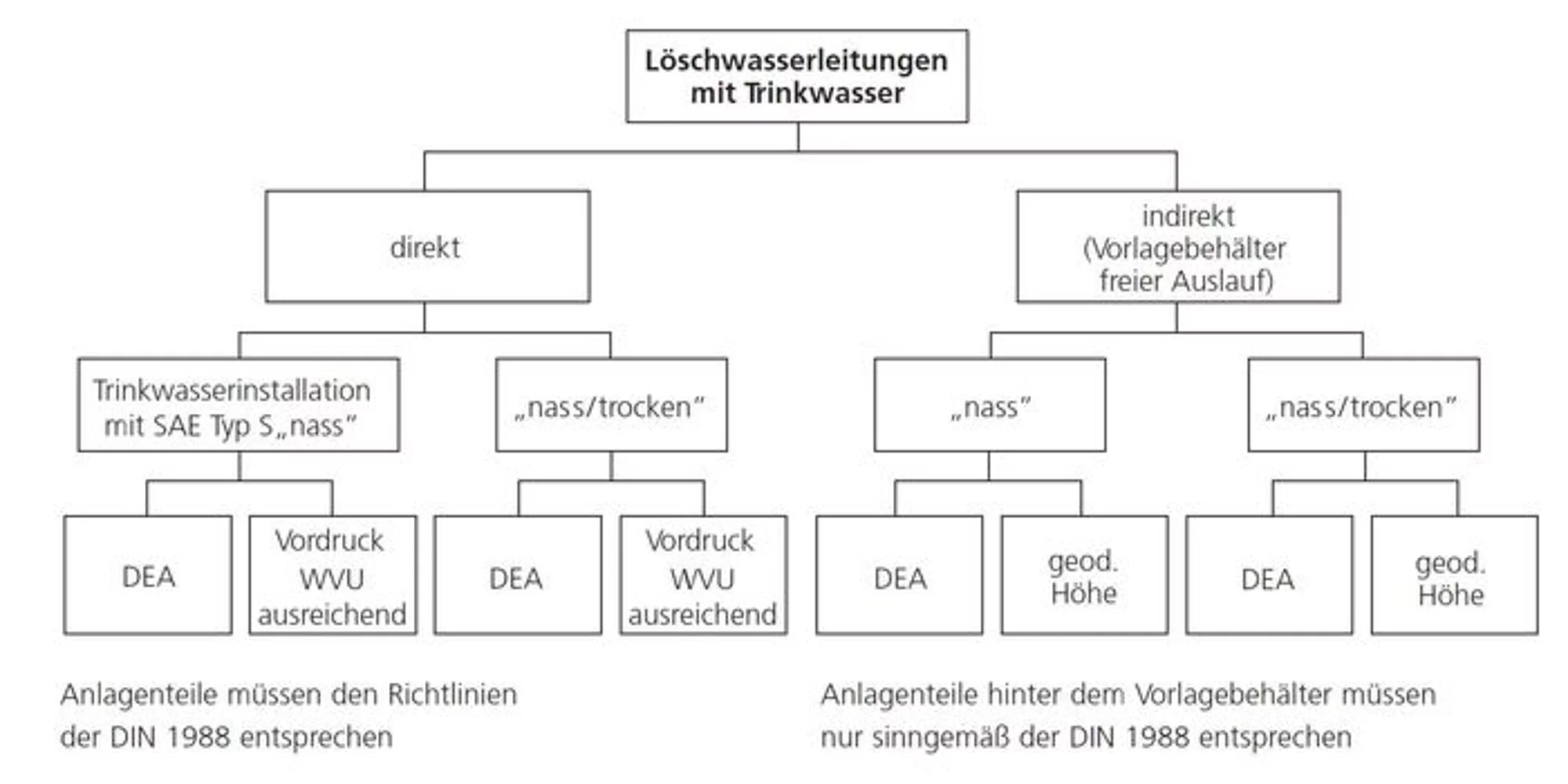 Der Aufbau der gesamten Löschwasserleitung bei den oben gezeigten Systemen bedingt einen mindestens 3-fachen Trinkwasservolumenwechsel pro Woche im Rohrnetz. Wenn diese Voraussetzung nicht gegeben ist, so ist ein indirekter Anschluss vorzusehen, wie in den folgenden Systemen gezeigt.